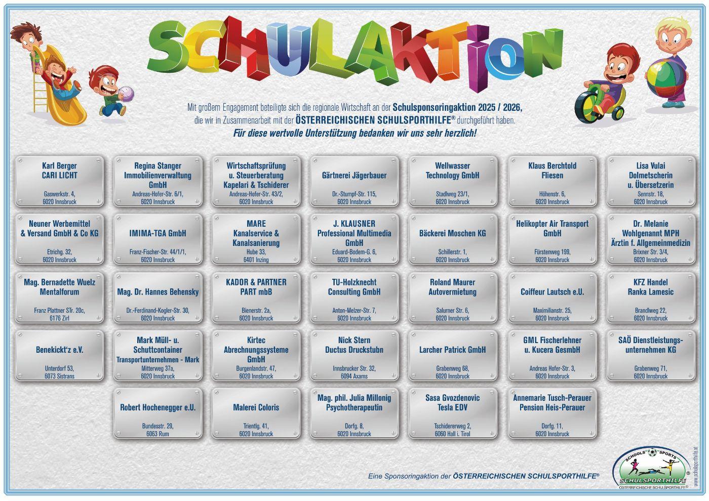 eine Sponsoring-Aktion für die Daniel-Sailer-Schule durchgeführt. Dank der hervorragenden Unterstützung von 153 Wirtschaftstreibenden und vielen Vertretern aus dem Gesundheitsbereich ist es gelungen, die Ausstattung der Klassen und der gesamten Schule, insbesondere des Turnsaals zu verbessern, zu ergänzen und zu erweitern.
